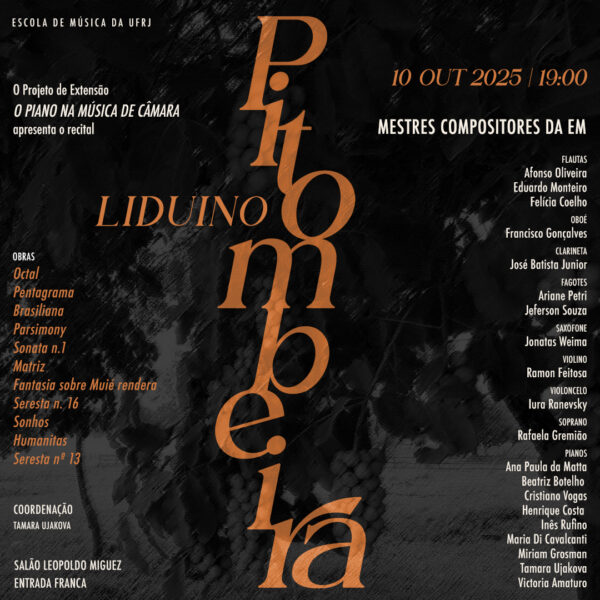O projeto de extensão “O Piano na Música de Câmara” apresenta, no dia 10 de outubro, às 19h, mais um concerto da Série Mestres Compositores da UFRJ. A edição é dedicada à obra camerística com piano do compositor e professor Liduíno Pitombeira. O recital acontece no Salão Leopoldo Miguez, com entrada franca.