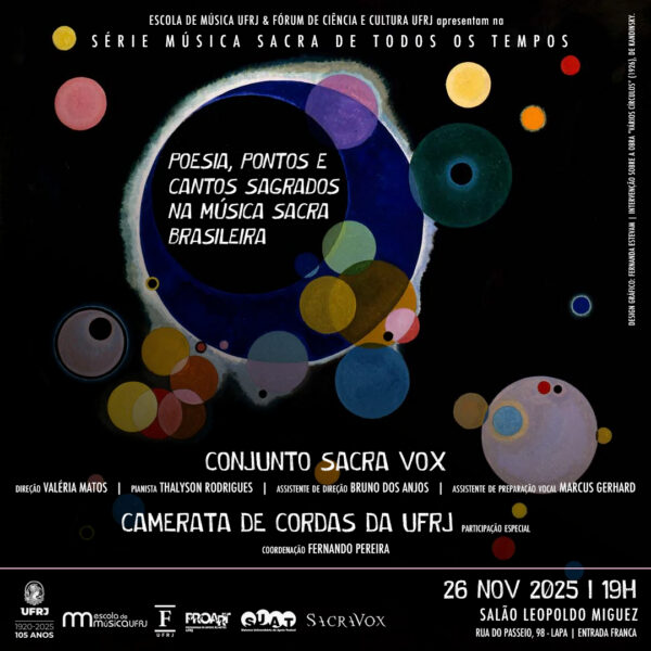 O Conjunto Sacra Vox apresenta, no dia 26 de novembro, o concerto “Poesia, Pontos e Cantos Sagrados na Música Sacra Brasileira”, que marca o encerramento da temporada 2025 da Série Música Sacra de Todos os Tempos. A apresentação acontece às 19h, no Salão Leopoldo Miguez da Escola de Música da UFRJ, com entrada franca.