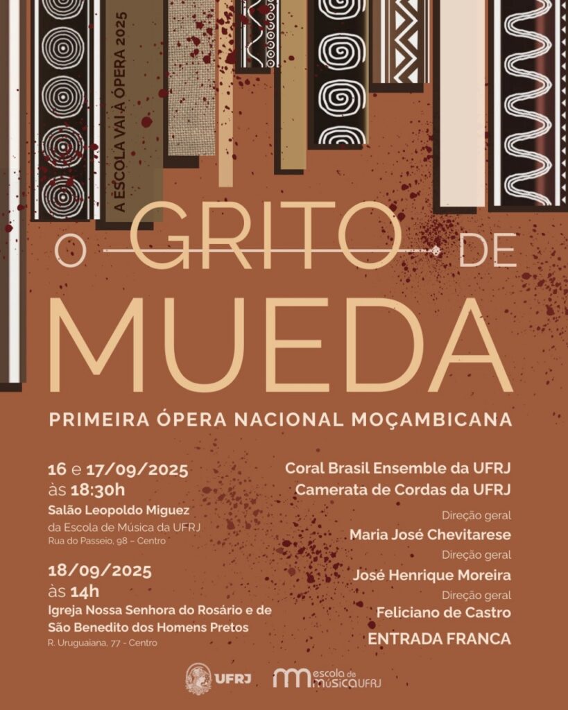 Fruto de um trabalho de criação coletiva que envolveu músicos e dramaturgos de Moçambique, Argentina e Brasil, O Grito de Mueda será apresentada em três concertos gratuitos no Rio de Janeiro. A ópera conta com a interpretação musical do Coral Brasil Ensemble da UFRJ e da Camerata de Cordas da UFRJ, sob a direção geral de Maria José Chevitarese, direção cênica de José Henrique Moreira e regência de Feliciano de Castro Comé.